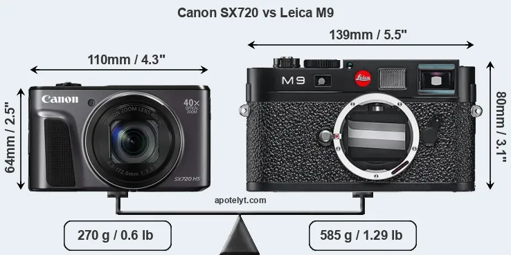 The physical size and weight of the Canon SX720 and the Leica M9 are illustrated in the side-by-side display below. The two cameras are presented according to their relative size. Three consecutive views from the front, the top, and the rear side are shown. All width, height and depth dimensions are rounded to the nearest millimeter.