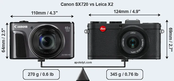 If the front view area (width x height) of the cameras is taken as an aggregate measure of their size, the Leica X2 is notably larger (22 percent) than the Canon SX720. Moreover, the X2 is markedly heavier (28 percent) than the SX720. In this context, it is worth noting that neither the SX720 nor the X2 are weather-sealed.