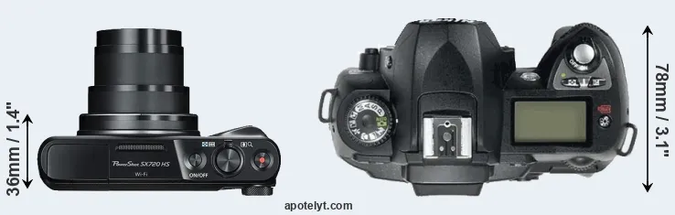 If the front view area (width x height) of the cameras is taken as an aggregate measure of their size, the Nikon D70 is considerably larger (121 percent) than the Canon SX720. In this context, it is worth noting that neither the SX720 nor the D70 are weather-sealed.