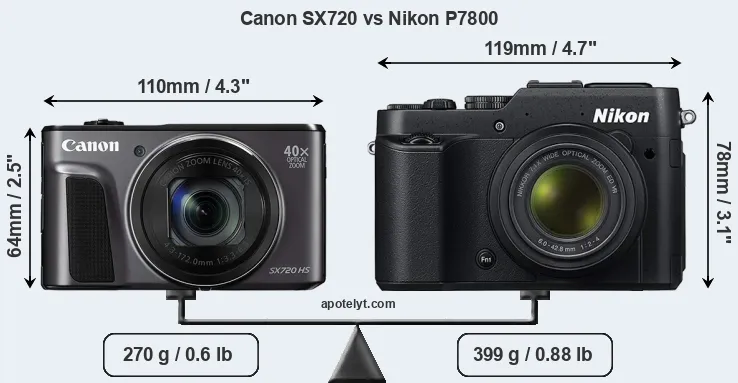 If the front view area (width x height) of the cameras is taken as an aggregate measure of their size, the Nikon P7800 is notably larger (32 percent) than the Canon SX720. Moreover, the P7800 is substantially heavier (48 percent) than the SX720. In this context, it is worth noting that neither the SX720 nor the P7800 are weather-sealed.