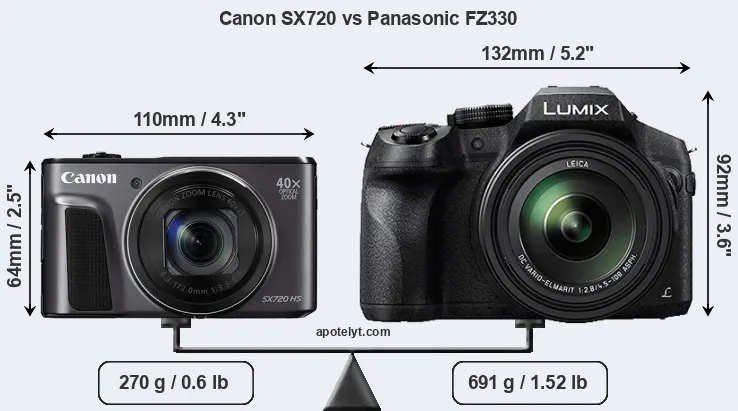 If the front view area (width x height) of the cameras is taken as an aggregate measure of their size, the Panasonic FZ330 is considerably larger (73 percent) than the Canon SX720. Moreover, the FZ330 is substantially heavier (156 percent) than the SX720. It is noteworthy in this context that the FZ330 is splash and dust-proof, while the SX720 does not feature any corresponding weather-sealing.