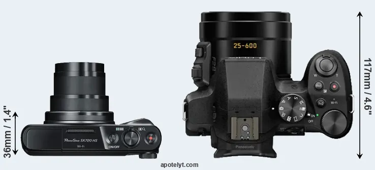 An illustration of the physical size and weight of the Canon SX720 and the Panasonic FZ330 is provided in the side-by-side display below. The two cameras are presented according to their relative size. Three consecutive perspectives from the front, the top, and the back are available. All size dimensions are rounded to the nearest millimeter.