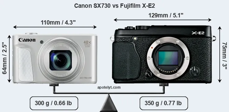 The side-by-side display below illustrates the physical size and weight of the Canon SX730 and the Fujifilm X-E2. The two cameras are presented according to their relative size. Three consecutive perspectives from the front, the top, and the back are available. All width, height and depth dimensions are rounded to the nearest millimeter.