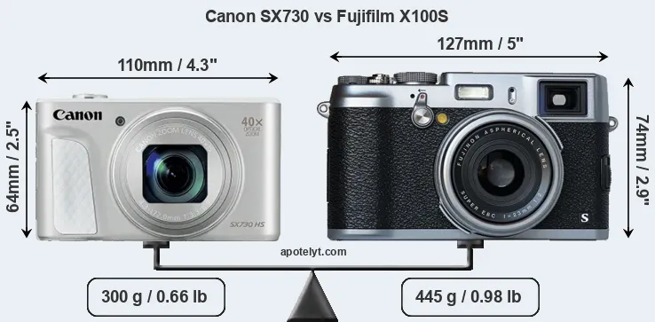 An illustration of the physical size and weight of the Canon SX730 and the Fujifilm X100S is provided in the side-by-side display below. The two cameras are presented according to their relative size. Three consecutive perspectives from the front, the top, and the back are available. All width, height and depth measures are rounded to the nearest millimeter.