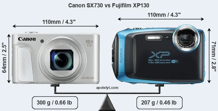 An illustration of the physical size and weight of the Canon SX730 and the Fujifilm XP130 is provided in the side-by-side display below. The two cameras are presented according to their relative size. Three consecutive views from the front, the top, and the rear side are shown. All width, height and depth measures are rounded to the nearest millimeter.