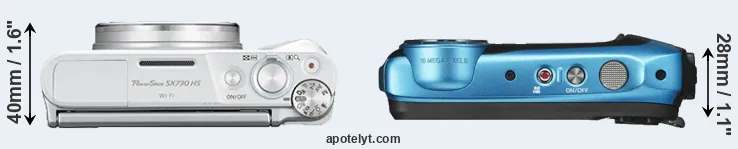 If the front view area (width x height) of the cameras is taken as an aggregate measure of their size, the Fujifilm XP130 is notably larger (11 percent) than the Canon SX730. However, the XP130 is markedly lighter (31 percent) than the SX730. It is noteworthy in this context that the XP130 is splash and dust-proof, while the SX730 does not feature any corresponding weather-sealing. More than that, the XP130 is water-proof up to 20m and can, thus, be used for underwater photography.