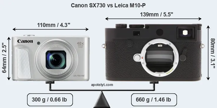 An illustration of the physical size and weight of the Canon SX730 and the Leica M10-P is provided in the side-by-side display below. The two cameras are presented according to their relative size. Three consecutive views from the front, the top, and the rear side are shown. All width, height and depth measures are rounded to the nearest millimeter.