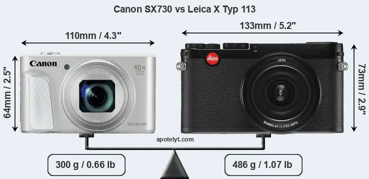 An illustration of the physical size and weight of the Canon SX730 and the Leica X Typ 113 is provided in the side-by-side display below. The two cameras are presented according to their relative size. Three consecutive perspectives from the front, the top, and the back are available. All size dimensions are rounded to the nearest millimeter.