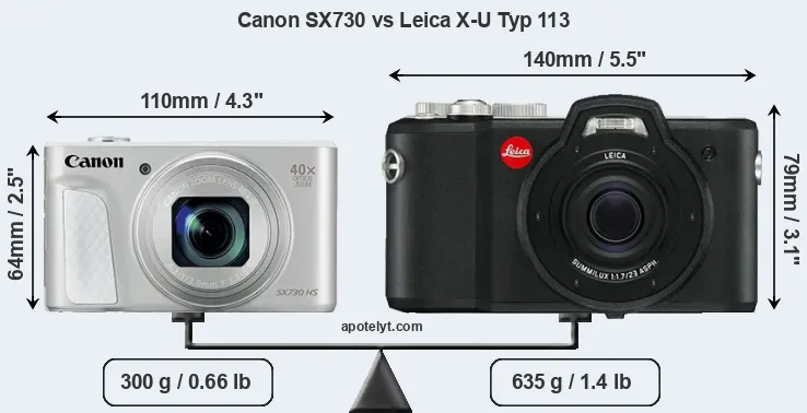 An illustration of the physical size and weight of the Canon SX730 and the Leica X-U Typ 113 is provided in the side-by-side display below. The two cameras are presented according to their relative size. Three consecutive perspectives from the front, the top, and the back are available. All width, height and depth measures are rounded to the nearest millimeter.