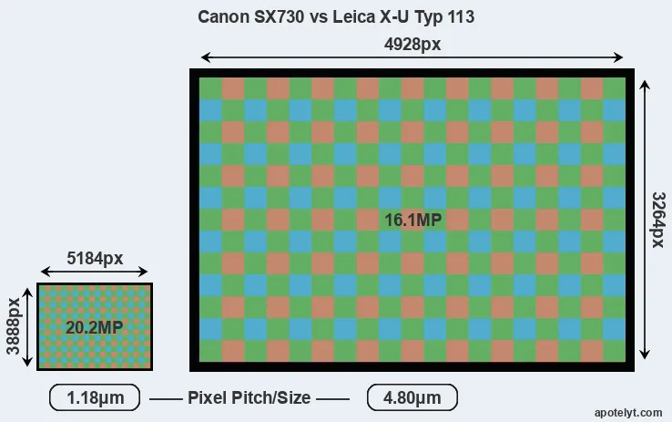 Despite having a smaller sensor, the Canon SX730 offers a higher resolution of 20.2 megapixels, compared with 16.1 MP of the Leica X-U Typ 113. This megapixels advantage comes at the cost of a higher pixel density and a smaller size of the individual pixel (with a pixel pitch of 1.18μm versus 4.80μm for the X-U Typ 113). However, it should be noted that the SX730 is a somewhat more recent model (by 1 year and 2 months) than the X-U Typ 113, and its sensor might have benefitted from technological advances during this time that partly offset its pixel-size disadvantage. Coming back to sensor resolution, it should be mentioned that the SX730 has no anti-alias filter installed, so that it can capture all the detail its sensor resolves.