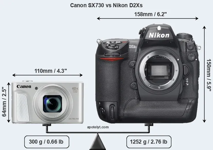 The side-by-side display below illustrates the physical size and weight of the Canon SX730 and the Nikon D2Xs. The two cameras are presented according to their relative size. Three consecutive views from the front, the top, and the rear side are shown. All width, height and depth measures are rounded to the nearest millimeter.