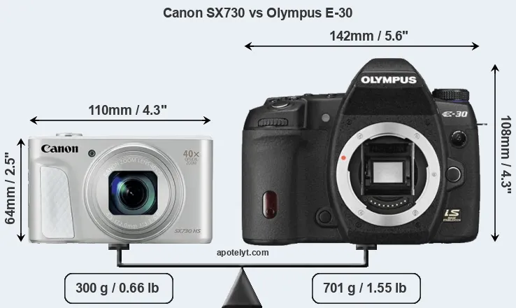 The above size and weight comparisons are to some extent incomplete and possibly misleading, as the SX730 has a lens built in, whereas the E-30 is an interchangeable lens camera that requires a separate lens. Attaching the latter will add extra weight and bulk to the setup. You can compare the optics available for the E-30 and their specifications in the Four Thirds Lens Catalog.