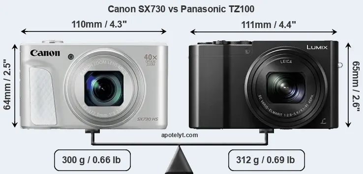 The side-by-side display below illustrates the physical size and weight of the Canon SX730 and the Panasonic TZ100. The two cameras are presented according to their relative size. Three successive views from the front, the top, and the rear are shown. All width, height and depth dimensions are rounded to the nearest millimeter.