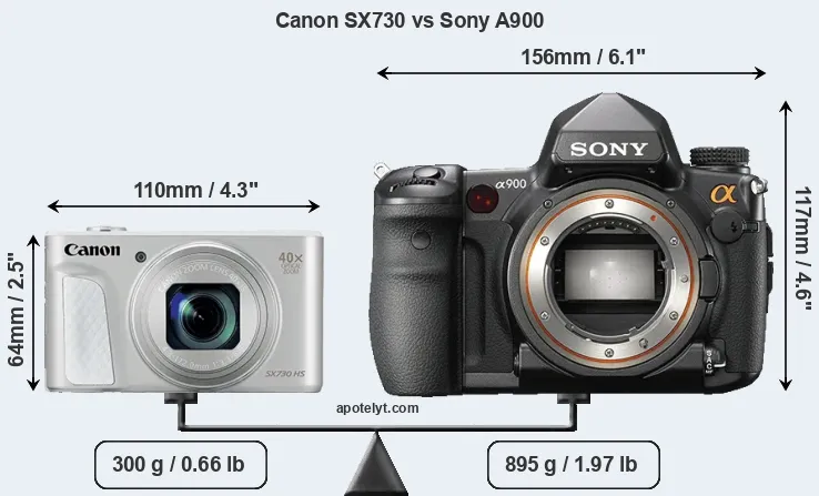 If the front view area (width x height) of the cameras is taken as an aggregate measure of their size, the Sony A900 is considerably larger (159 percent) than the Canon SX730. It is noteworthy in this context that the A900 is splash and dust-proof, while the SX730 does not feature any corresponding weather-sealing.