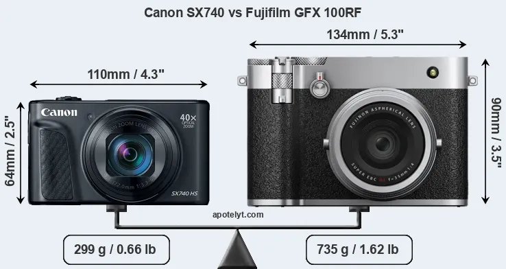 The side-by-side display below illustrates the physical size and weight of the Canon SX740 and the Fujifilm GFX 100RF. The two cameras are presented according to their relative size. Three consecutive perspectives from the front, the top, and the back are available. All width, height and depth dimensions are rounded to the nearest millimeter.