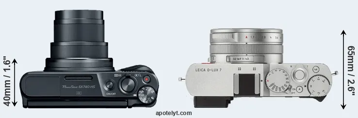 The side-by-side display below illustrates the physical size and weight of the Canon SX740 and the Leica D-LUX 7. The two cameras are presented according to their relative size. Three consecutive views from the front, the top, and the rear side are shown. All width, height and depth dimensions are rounded to the nearest millimeter.