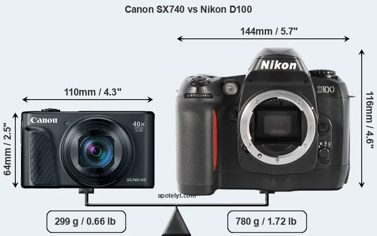 An illustration of the physical size and weight of the Canon SX740 and the Nikon D100 is provided in the side-by-side display below. The two cameras are presented according to their relative size. Three consecutive views from the front, the top, and the rear side are shown. All width, height and depth measures are rounded to the nearest millimeter.