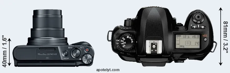 The above size and weight comparisons are to some extent incomplete and possibly misleading, as the SX740 has a lens built in, whereas the D100 is an interchangeable lens camera that requires a separate lens. Attaching the latter will add extra weight and bulk to the setup. You can compare the optics available for the D100 and their specifications in the Nikon Lens Catalog.
