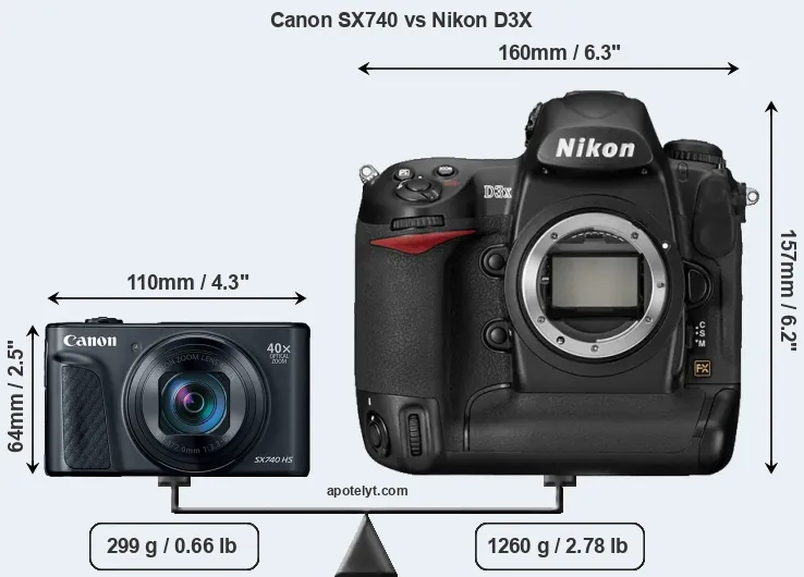 An illustration of the physical size and weight of the Canon SX740 and the Nikon D3X is provided in the side-by-side display below. The two cameras are presented according to their relative size. Three consecutive perspectives from the front, the top, and the back are available. All size dimensions are rounded to the nearest millimeter.