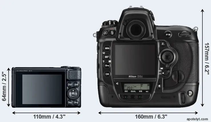 If the front view area (width x height) of the cameras is taken as an aggregate measure of their size, the Nikon D3X is considerably larger (257 percent) than the Canon SX740. It is noteworthy in this context that the D3X is splash and dust-proof, while the SX740 does not feature any corresponding weather-sealing.
