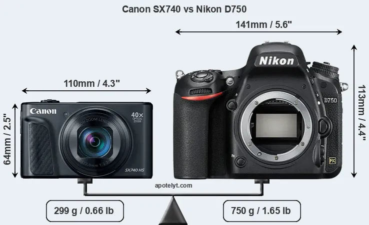 The physical size and weight of the Canon SX740 and the Nikon D750 are illustrated in the side-by-side display below. The two cameras are presented according to their relative size. Three consecutive perspectives from the front, the top, and the back are available. All width, height and depth measures are rounded to the nearest millimeter.