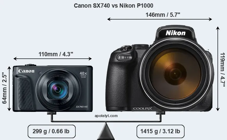 If the front view area (width x height) of the cameras is taken as an aggregate measure of their size, the Nikon P1000 is considerably larger (147 percent) than the Canon SX740. Moreover, the P1000 is substantially heavier (373 percent) than the SX740. In this context, it is worth noting that neither the SX740 nor the P1000 are weather-sealed.