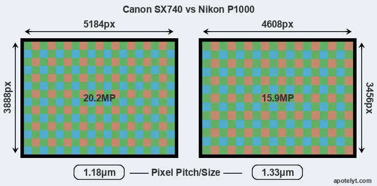 While the two cameras under review share the same sensor size, the SX740 offers a higher resolution of 20.2 megapixels, compared with 15.9 MP of the P1000. This megapixels advantage translates into a 13 percent gain in linear resolution. On the other hand, these sensor specs imply that the SX740 has a higher pixel density and a smaller size of the individual pixel (with a pixel pitch of 1.18μm versus 1.33μm for the P1000). It is noteworthy in this context that the two cameras were released in close succession, so that their sensors are from the same technological generation. Coming back to sensor resolution, it should be mentioned that neither of the two cameras has an anti-alias filter installed, so they are able to capture all the detail the sensor resolves.