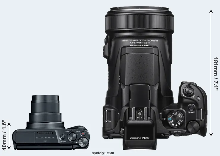 The physical size and weight of the Canon SX740 and the Nikon P1000 are illustrated in the side-by-side display below. The two cameras are presented according to their relative size. Three successive views from the front, the top, and the rear are shown. All width, height and depth measures are rounded to the nearest millimeter.