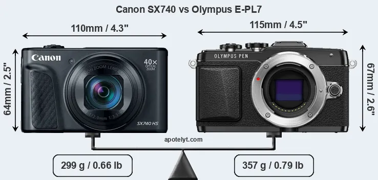 An illustration of the physical size and weight of the Canon SX740 and the Olympus E-PL7 is provided in the side-by-side display below. The two cameras are presented according to their relative size. Three successive views from the front, the top, and the rear are shown. All size dimensions are rounded to the nearest millimeter.