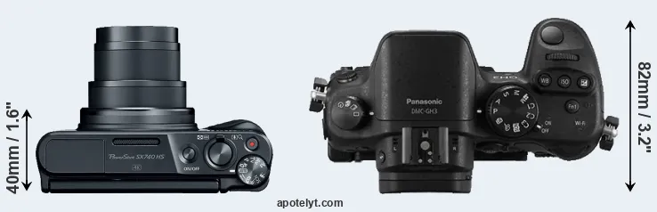 The side-by-side display below illustrates the physical size and weight of the Canon SX740 and the Panasonic GH3. The two cameras are presented according to their relative size. Three consecutive perspectives from the front, the top, and the back are available. All size dimensions are rounded to the nearest millimeter.