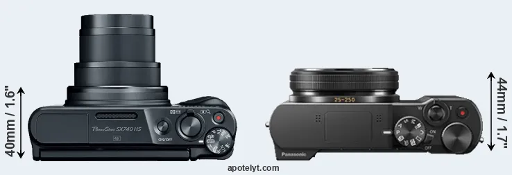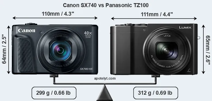 The side-by-side display below illustrates the physical size and weight of the Canon SX740 and the Panasonic TZ100. The two cameras are presented according to their relative size. Three consecutive perspectives from the front, the top, and the back are available. All width, height and depth measures are rounded to the nearest millimeter.
