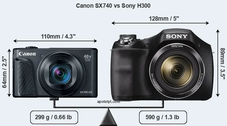 If the front view area (width x height) of the cameras is taken as an aggregate measure of their size, the Sony H300 is considerably larger (62 percent) than the Canon SX740. Moreover, the H300 is substantially heavier (97 percent) than the SX740. In this context, it is worth noting that neither the SX740 nor the H300 are weather-sealed.