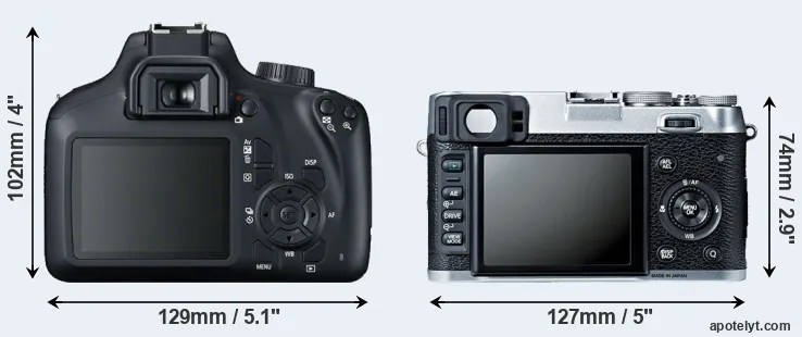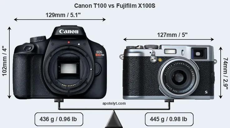 The physical size and weight of the Canon T100 and the Fujifilm X100S are illustrated in the side-by-side display below. The two cameras are presented according to their relative size. Three successive views from the front, the top, and the rear are shown. All width, height and depth measures are rounded to the nearest millimeter.