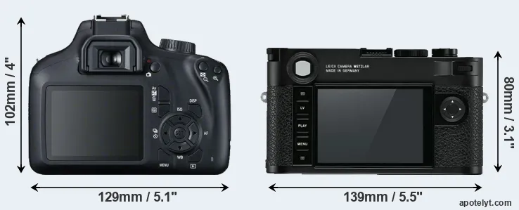 Going beyond this snapshot of core features and characteristics, what are the differences between the Canon EOS Rebel T100 and the Leica M10 (Typ 3656)? Which one should you buy? Read on to find out how these two cameras compare with respect to their body size, their imaging sensors, their shooting features, their input-output connections, and their reception by expert reviewers.