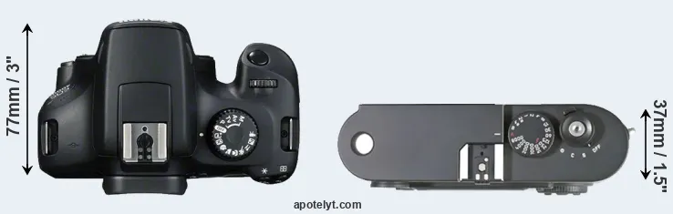 An illustration of the physical size and weight of the Canon T100 and the Leica M8 is provided in the side-by-side display below. The two cameras are presented according to their relative size. Three successive views from the front, the top, and the rear are shown. All width, height and depth dimensions are rounded to the nearest millimeter.