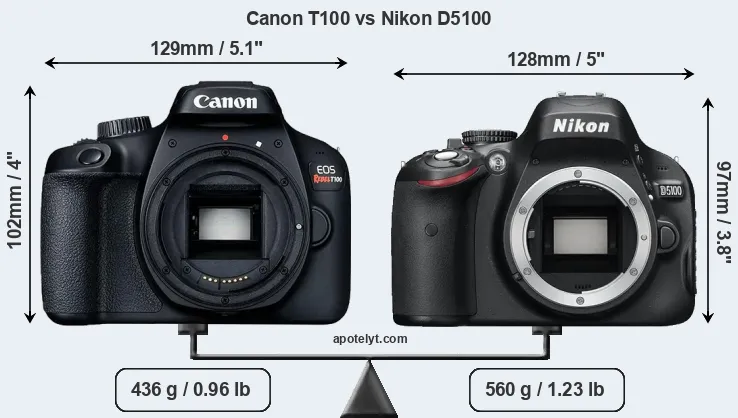The side-by-side display below illustrates the physical size and weight of the Canon T100 and the Nikon D5100. The two cameras are presented according to their relative size. Three consecutive views from the front, the top, and the rear side are shown. All size dimensions are rounded to the nearest millimeter.