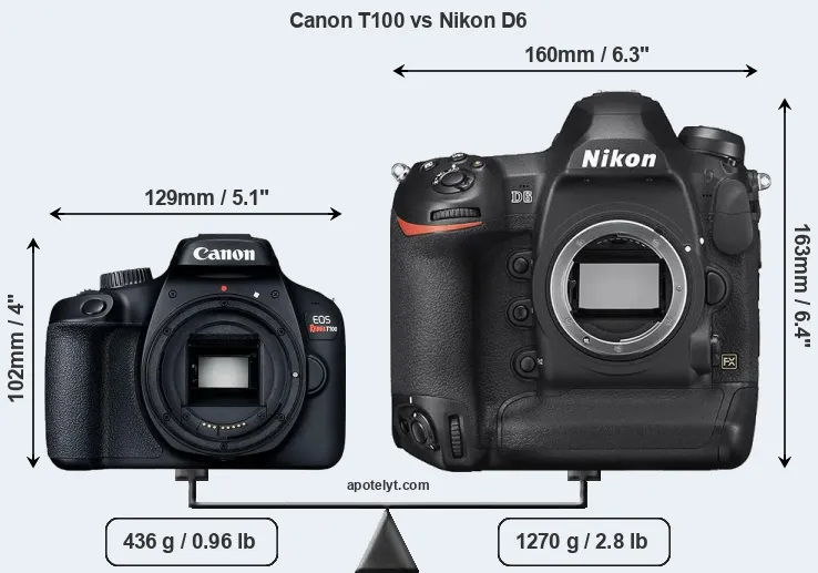 If the front view area (width x height) of the cameras is taken as an aggregate measure of their size, the Nikon D6 is considerably larger (98 percent) than the Canon T100. Moreover, the D6 is substantially heavier (191 percent) than the T100. It is noteworthy in this context that the D6 is splash and dust-proof, while the T100 does not feature any corresponding weather-sealing.