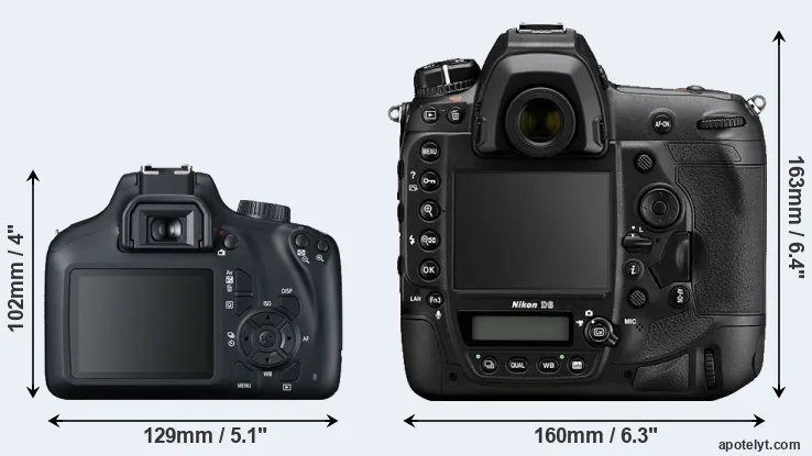 Going beyond this snapshot of core features and characteristics, what are the differences between the Canon EOS Rebel T100 and the Nikon D6? Which one should you buy? Read on to find out how these two cameras compare with respect to their body size, their imaging sensors, their shooting features, their input-output connections, and their reception by expert reviewers.