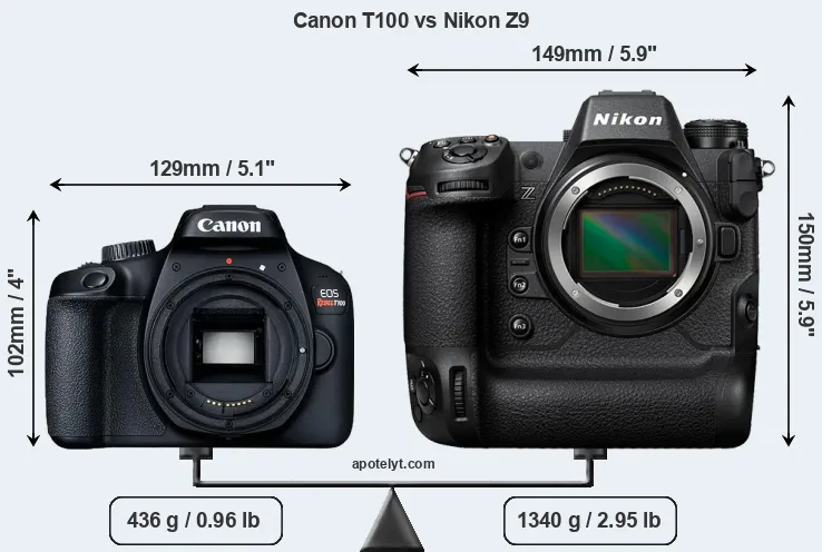 If the front view area (width x height) of the cameras is taken as an aggregate measure of their size, the Nikon Z9 is considerably larger (70 percent) than the Canon T100. Moreover, the Z9 is substantially heavier (207 percent) than the T100. It is noteworthy in this context that the Z9 is splash and dust-proof, while the T100 does not feature any corresponding weather-sealing.
