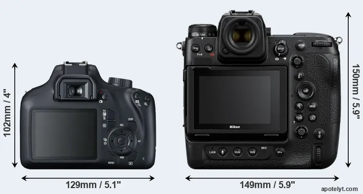 The side-by-side display below illustrates the physical size and weight of the Canon T100 and the Nikon Z9. The two cameras are presented according to their relative size. Three successive views from the front, the top, and the rear are shown. All width, height and depth dimensions are rounded to the nearest millimeter.