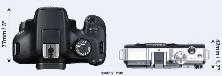 An illustration of the physical size and weight of the Canon T100 and the Olympus E-PL1 is provided in the side-by-side display below. The two cameras are presented according to their relative size. Three successive views from the front, the top, and the rear are shown. All width, height and depth dimensions are rounded to the nearest millimeter.