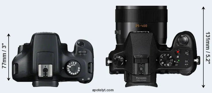 The side-by-side display below illustrates the physical size and weight of the Canon T100 and the Panasonic FZ1000. The two cameras are presented according to their relative size. Three consecutive perspectives from the front, the top, and the back are available. All width, height and depth measures are rounded to the nearest millimeter.