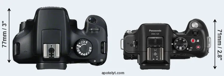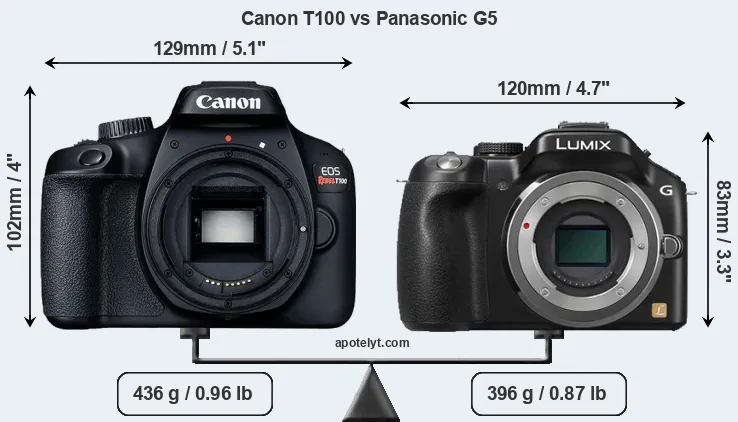 An illustration of the physical size and weight of the Canon T100 and the Panasonic G5 is provided in the side-by-side display below. The two cameras are presented according to their relative size. Three successive views from the front, the top, and the rear are shown. All width, height and depth dimensions are rounded to the nearest millimeter.
