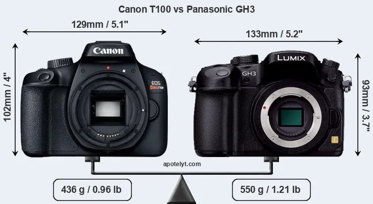 The physical size and weight of the Canon T100 and the Panasonic GH3 are illustrated in the side-by-side display below. The two cameras are presented according to their relative size. Three consecutive perspectives from the front, the top, and the back are available. All size dimensions are rounded to the nearest millimeter.