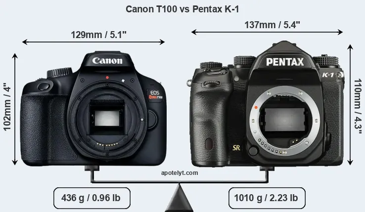 If the front view area (width x height) of the cameras is taken as an aggregate measure of their size, the Pentax K-1 is notably larger (15 percent) than the Canon T100. Moreover, the K-1 is substantially heavier (132 percent) than the T100. It is noteworthy in this context that the K-1 is splash and dust-proof, while the T100 does not feature any corresponding weather-sealing.