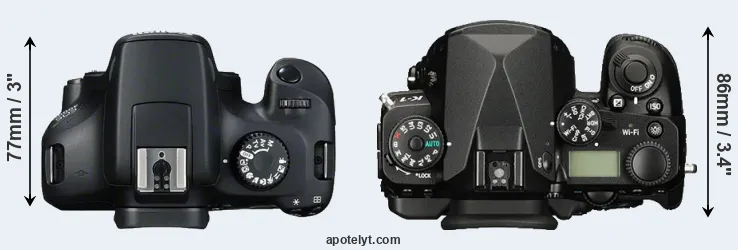 The side-by-side display below illustrates the physical size and weight of the Canon T100 and the Pentax K-1. The two cameras are presented according to their relative size. Three consecutive perspectives from the front, the top, and the back are available. All width, height and depth measures are rounded to the nearest millimeter.