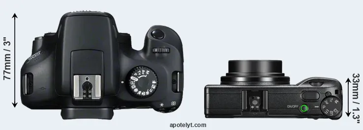 The side-by-side display below illustrates the physical size and weight of the Canon T100 and the Ricoh GR III. The two cameras are presented according to their relative size. Three consecutive views from the front, the top, and the rear side are shown. All width, height and depth dimensions are rounded to the nearest millimeter.