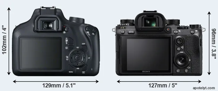 An illustration of the physical size and weight of the Canon T100 and the Sony A9 is provided in the side-by-side display below. The two cameras are presented according to their relative size. Three consecutive views from the front, the top, and the rear side are shown. All size dimensions are rounded to the nearest millimeter.