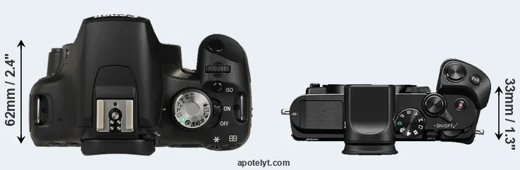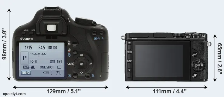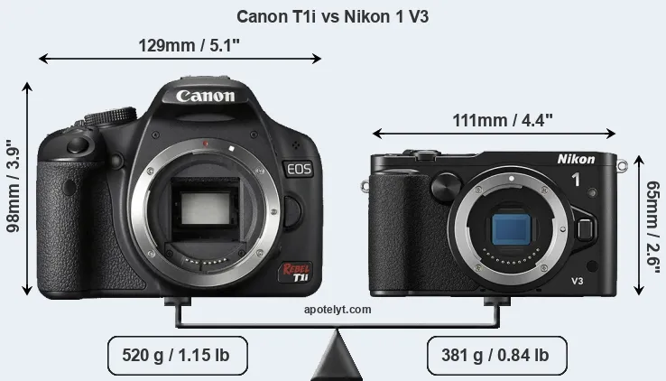 The side-by-side display below illustrates the physical size and weight of the Canon T1i and the Nikon 1 V3. The two cameras are presented according to their relative size. Three consecutive perspectives from the front, the top, and the back are available. All width, height and depth dimensions are rounded to the nearest millimeter.