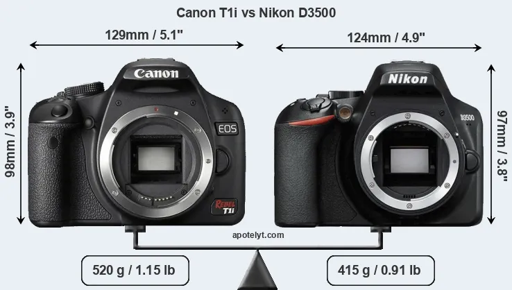 The physical size and weight of the Canon T1i and the Nikon D3500 are illustrated in the side-by-side display below. The two cameras are presented according to their relative size. Three consecutive perspectives from the front, the top, and the back are available. All width, height and depth dimensions are rounded to the nearest millimeter.